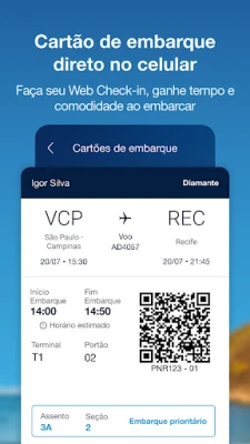 Após a confirmação, o controle da sua viagem permanece em suas mãos. Acesse suas reservas ativas com facilidade, gerencie detalhes essenciais como a aquisição antecipada de bagagens e a seleção de assentos para voar com o máximo conforto. Diga adeus às filas com o check-in online, um recurso prático que otimiza seu tempo no aeroporto. E para um embarque sem complicações, seu cartão de embarque digital estará sempre acessível no aplicativo da Azul, a um toque de distância.